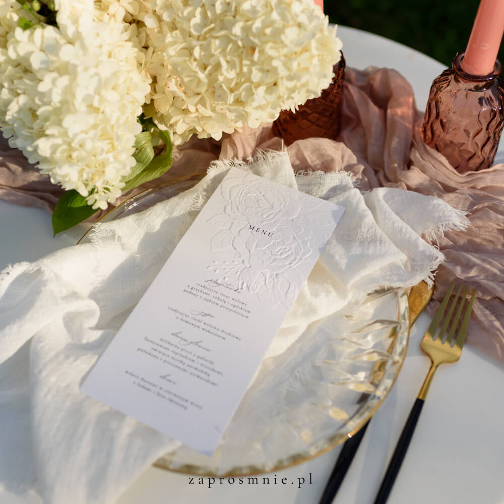 Menu weselne w bieli z eleganckim tłoczeniem kwiatowym, subtelna papeteria ślubna o romantycznym charakterze, idealna do klasycznych, glamour i rustykalnych aranżacji, dekoracyjny i praktyczny element stołu weselnego, który zachwyca gości i dodaje uroku całemu przyjęciu.