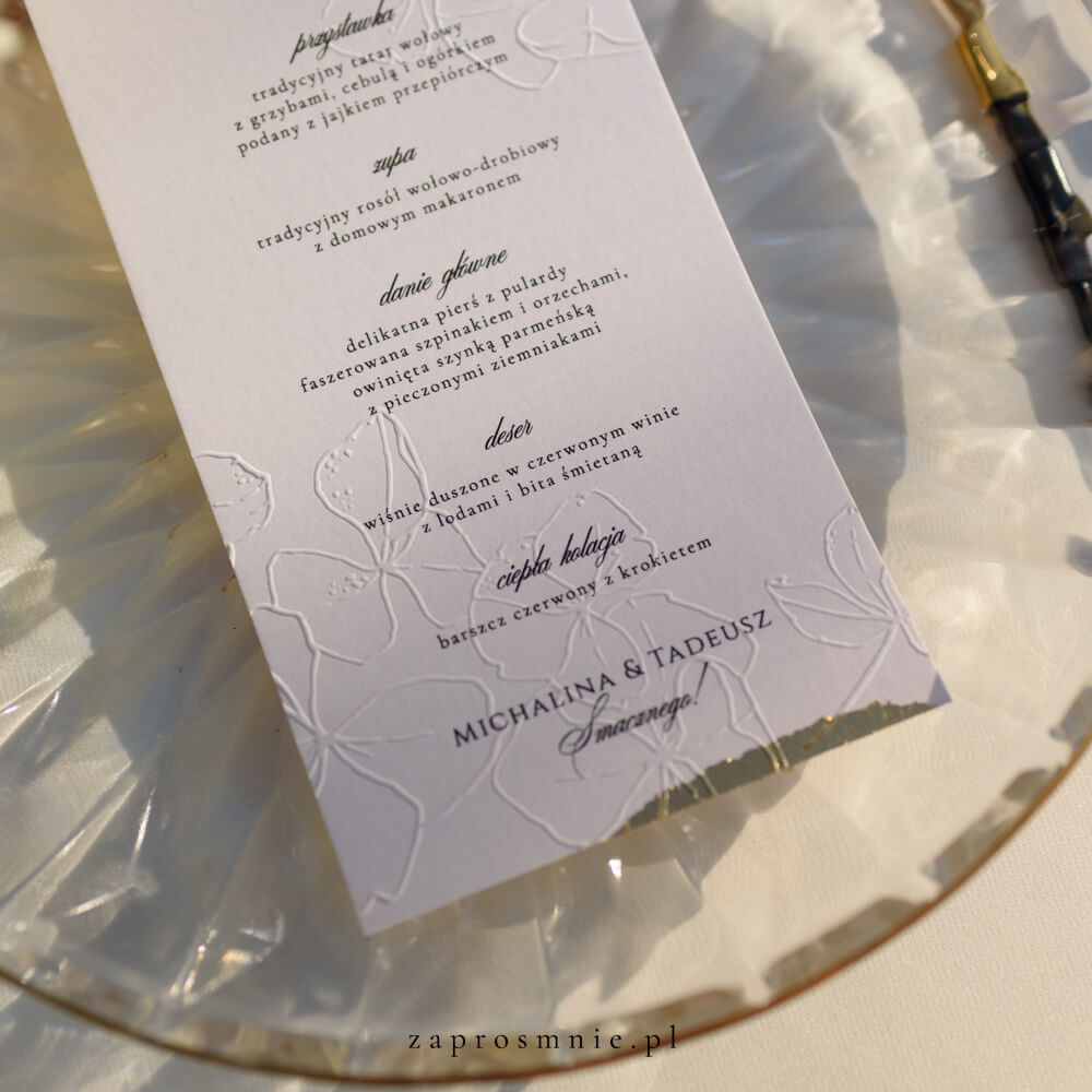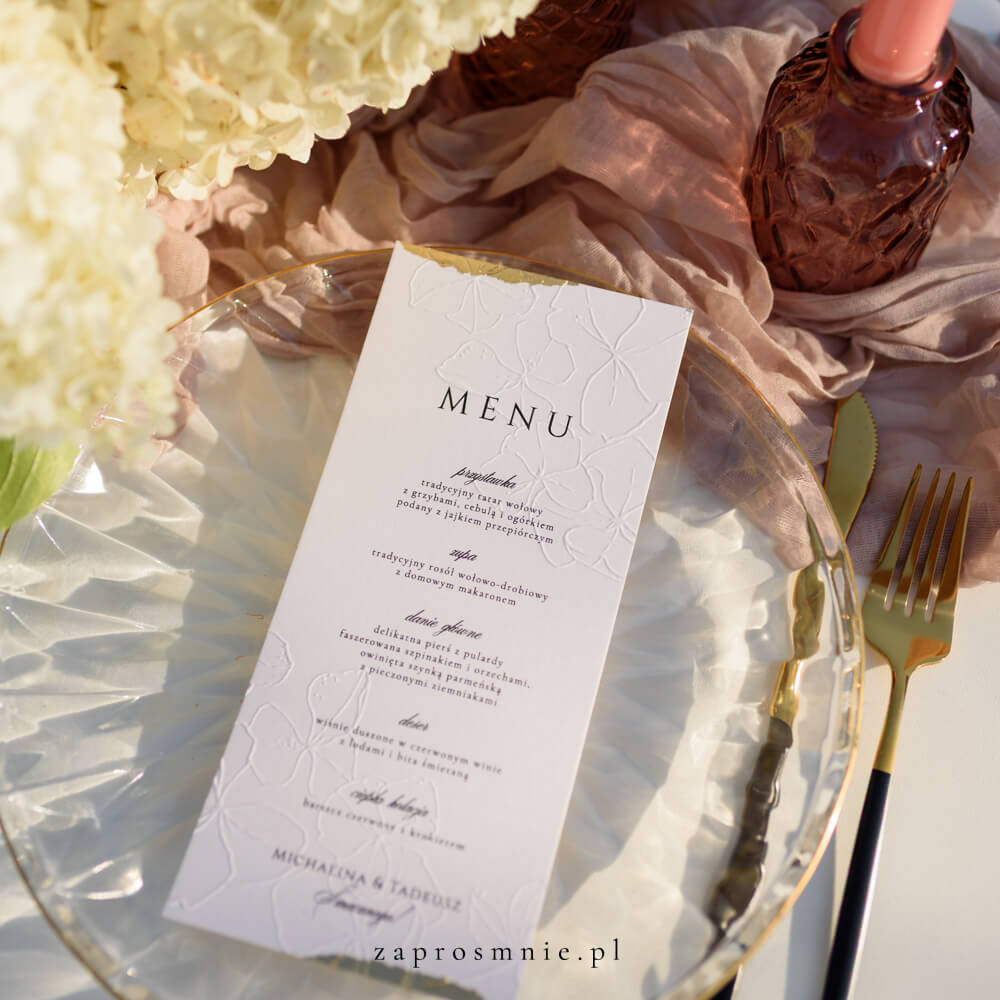 Ekskluzywne menu weselne z delikatnym tłoczeniem kwiatowym i eleganckim złotym wykończeniem to propozycja dla par, które cenią sobie luksusowe detale. Biała baza z minimalistyczną typografią doskonale komponuje się z klasyczną i glamour aranżacją weselną.