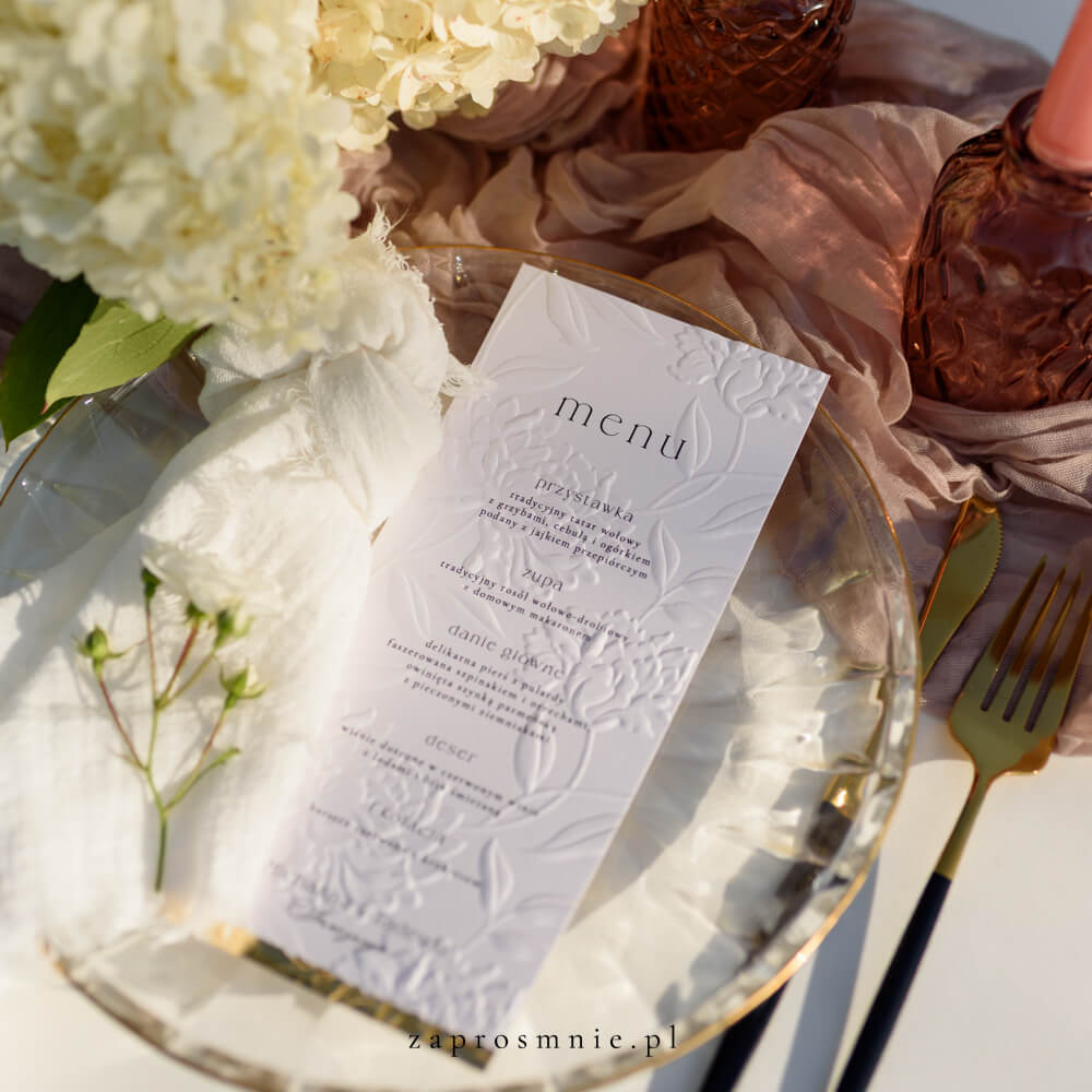 Menu weselne z tłoczeniem kwiatowym to idealny wybór dla par, które marzą o klasycznej i eleganckiej oprawie ślubu. Subtelne zdobienie w formie wypukłych kwiatów dodaje wyjątkowego charakteru, a minimalistyczny układ treści sprawia, że całość jest czytelna i ponadczasowa.