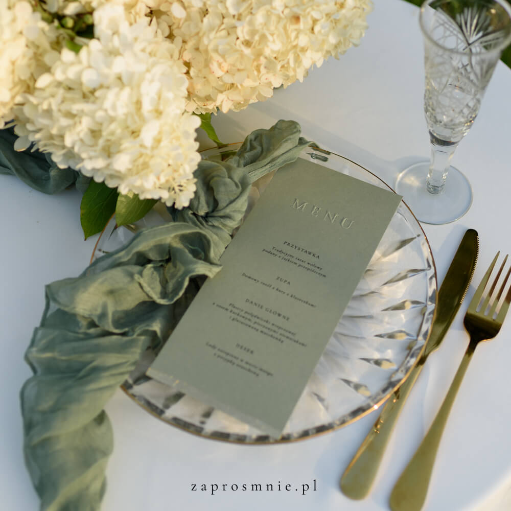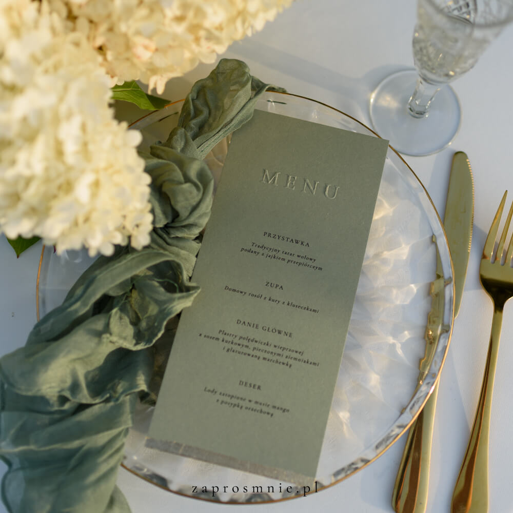 Zielone menu weselne z tłoczonym napisem to wyjątkowy element papeterii ślubnej, który zachwyca elegancją i oryginalnością. Głęboki, szlachetny odcień zieleni w połączeniu z tłoczeniem tworzy nietuzinkowy efekt, idealnie komponując się z naturalnymi dekoracjami, kwiatami i świeżymi aranżacjami stołów.