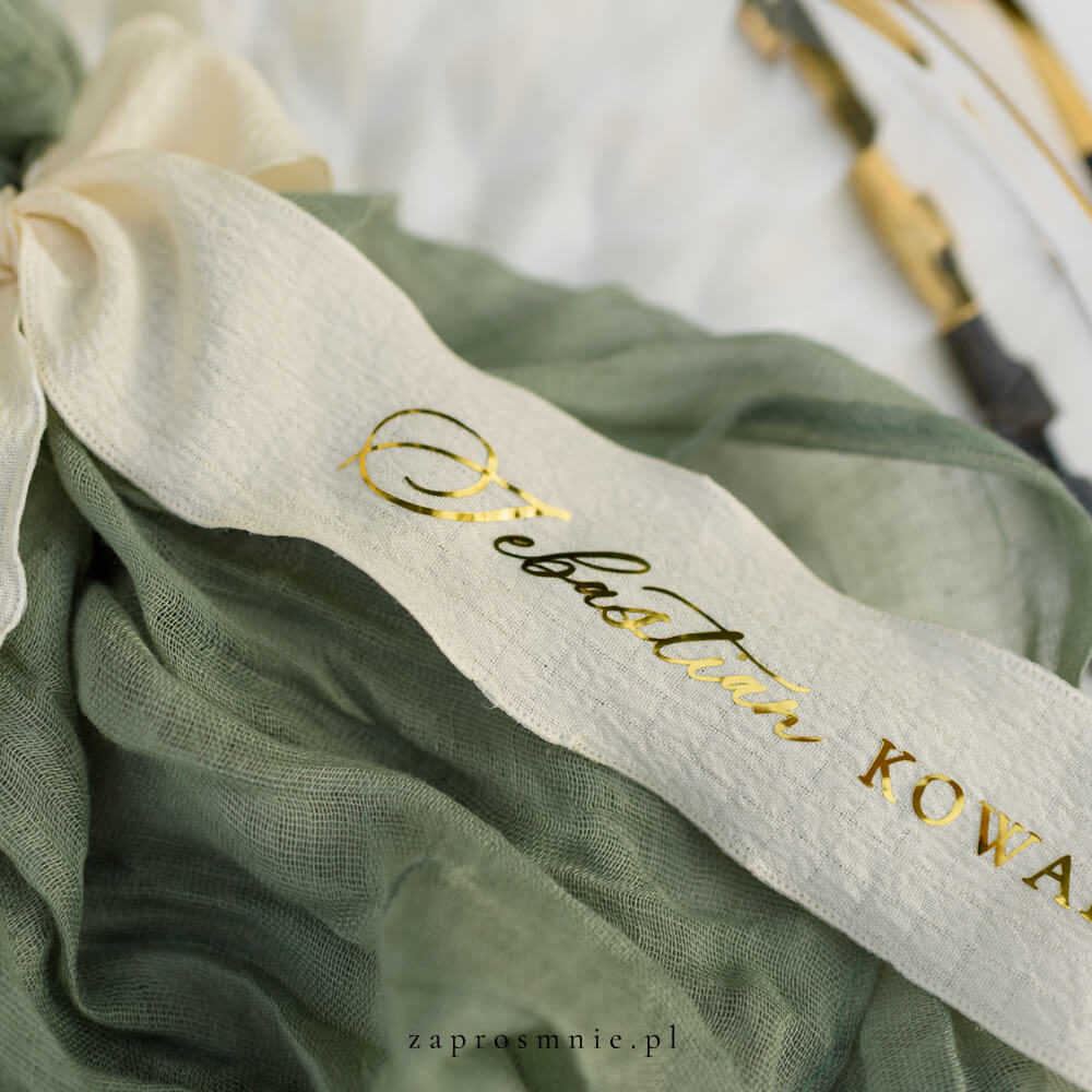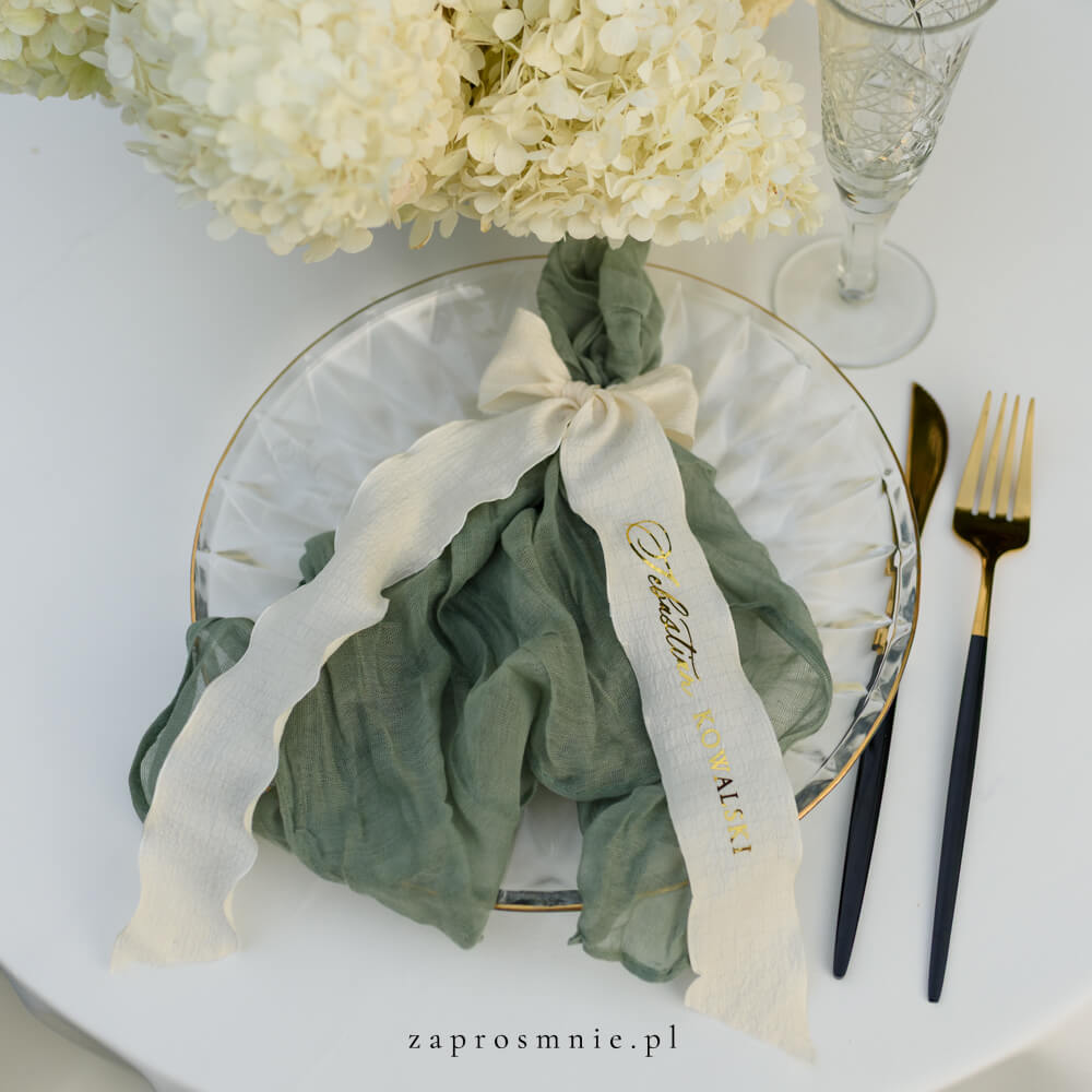 Wstążka pełniąca rolę winietki to nietuzinkowa alternatywa dla klasycznych karteczek – wyróżnia się formą, przyciąga uwagę i staje się elementem, o którym goście będą mówić jeszcze długo po weselu. Można ją przewiązać na kieliszku, serwetce, pudełeczku z upominkiem czy nawet krześle – jej zastosowanie daje mnóstwo kreatywnych możliwości.