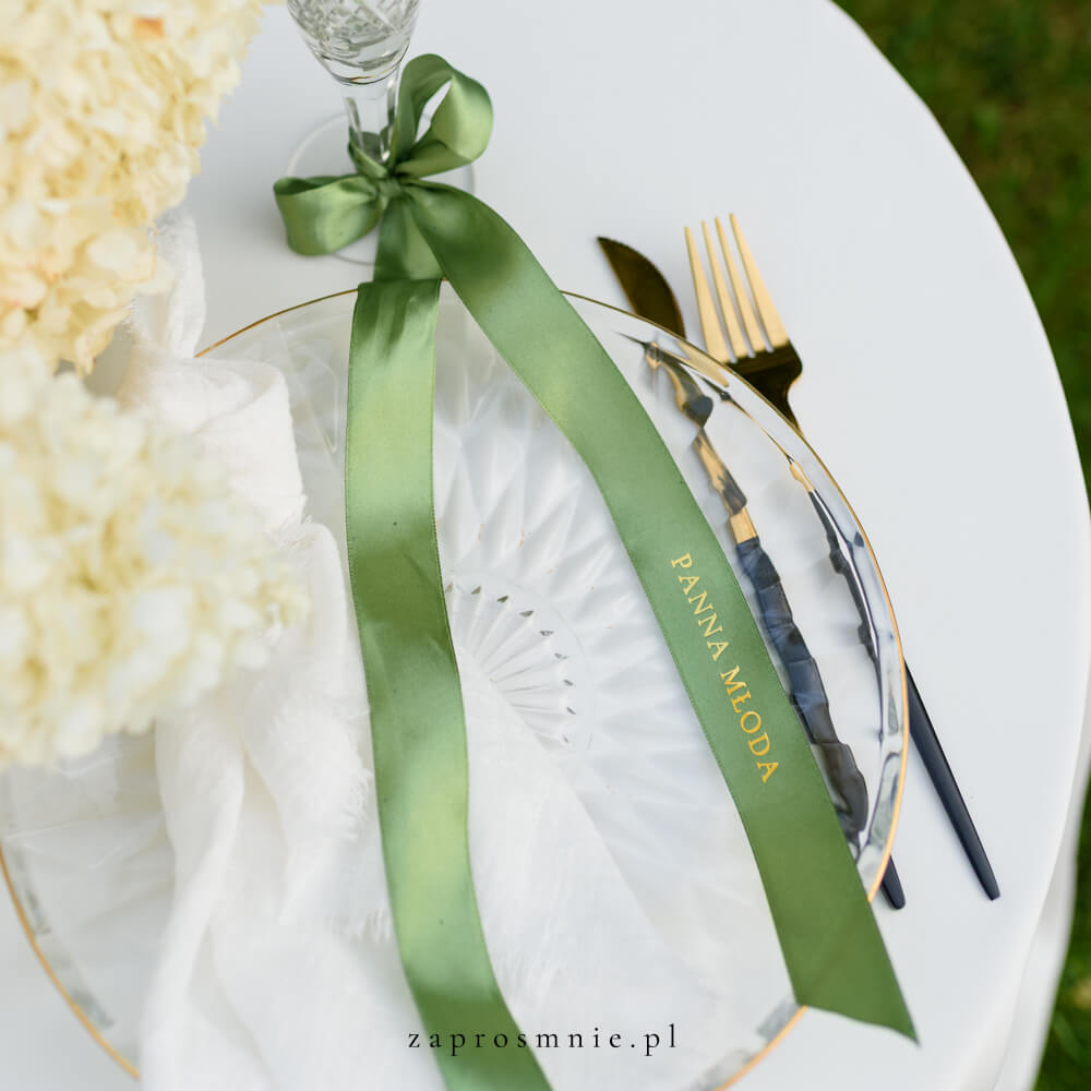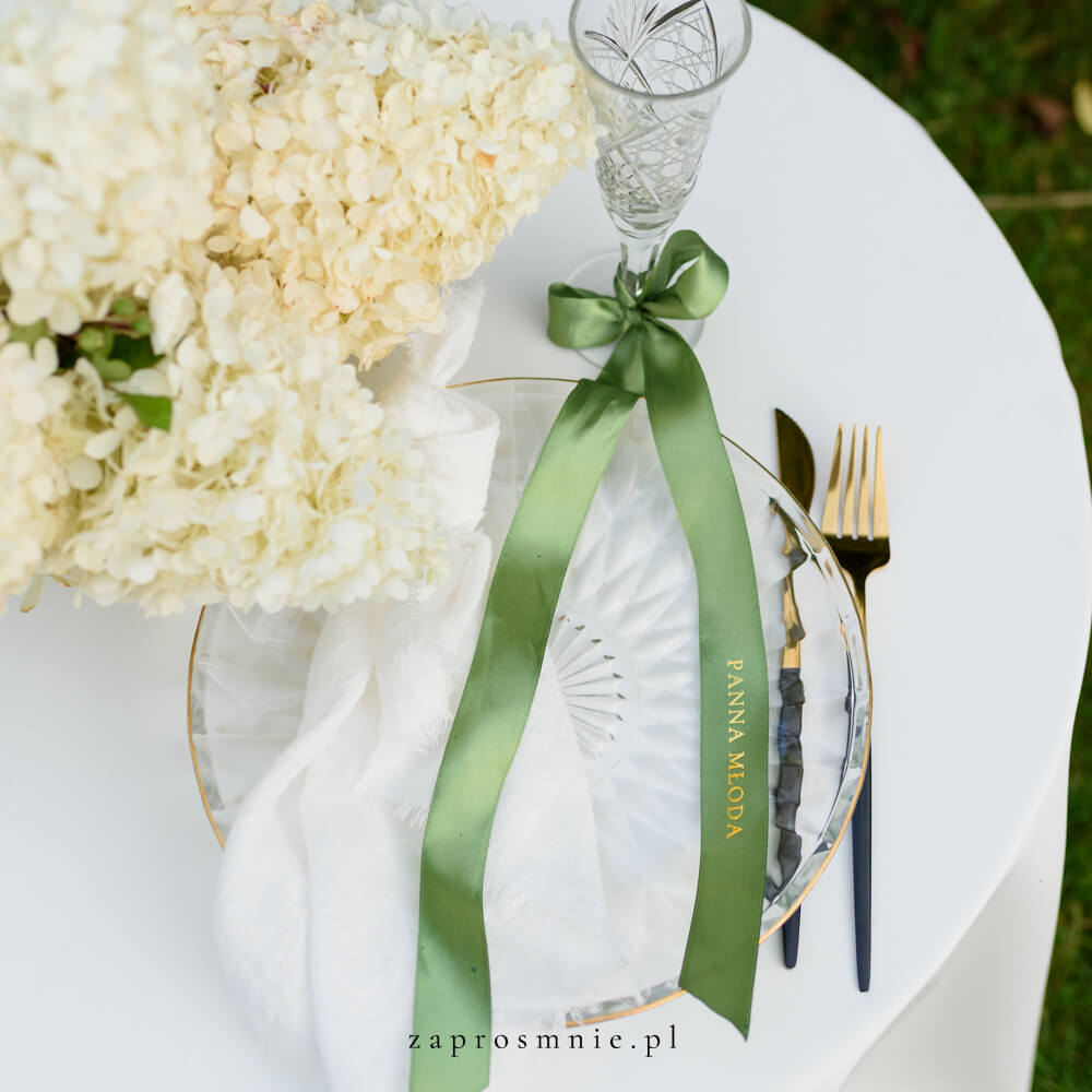 Wstążka pełniąca rolę winietki to nietuzinkowa alternatywa dla klasycznych karteczek – wyróżnia się formą, przyciąga uwagę i staje się elementem, o którym goście będą mówić jeszcze długo po weselu. Można ją przewiązać na kieliszku, serwetce, pudełeczku z upominkiem czy nawet krześle – jej zastosowanie daje mnóstwo kreatywnych możliwości.