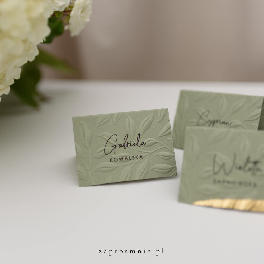 Winietka ślubna w eleganckim odcieniu ciemniejszej zieleni, zdobiona subtelnym tłoczeniem roślinnym oraz delikatnym złotym akcentem u dołu. To wyjątkowy element dekoracji weselnej, który nie tylko ułatwia gościom odnalezienie swojego miejsca, ale także stanowi elegancką ozdobę stołu.